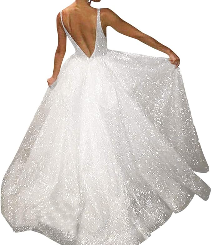 Amphia Damen Prinzessin Kleid Cocktailkleid Hochzeitkleid Abendkleid Damen Sexy Einfarbig Armellose V Ausschnitt Sling Sequin Lange Sequin Langes Volles Kleid Amazon De Fashion